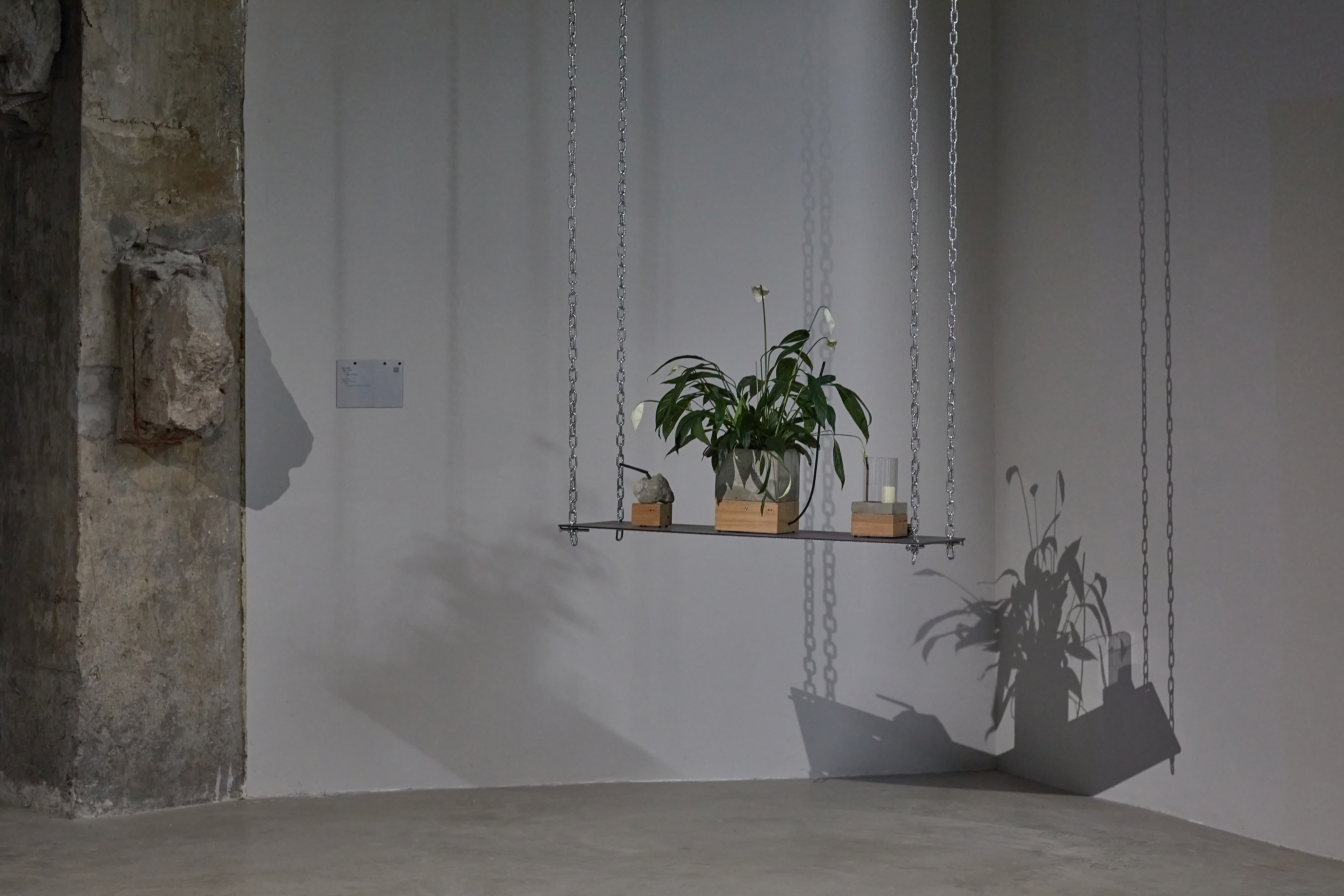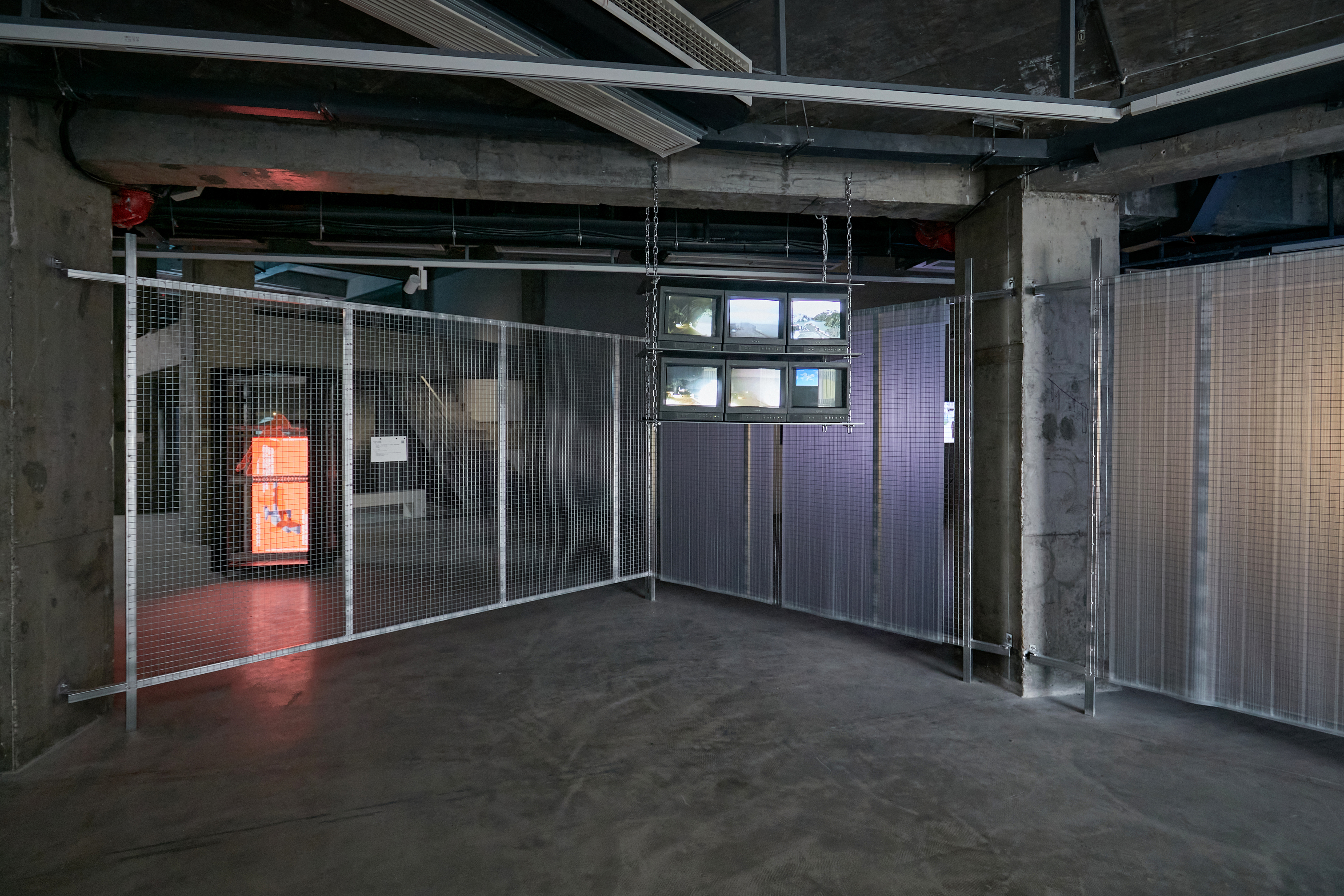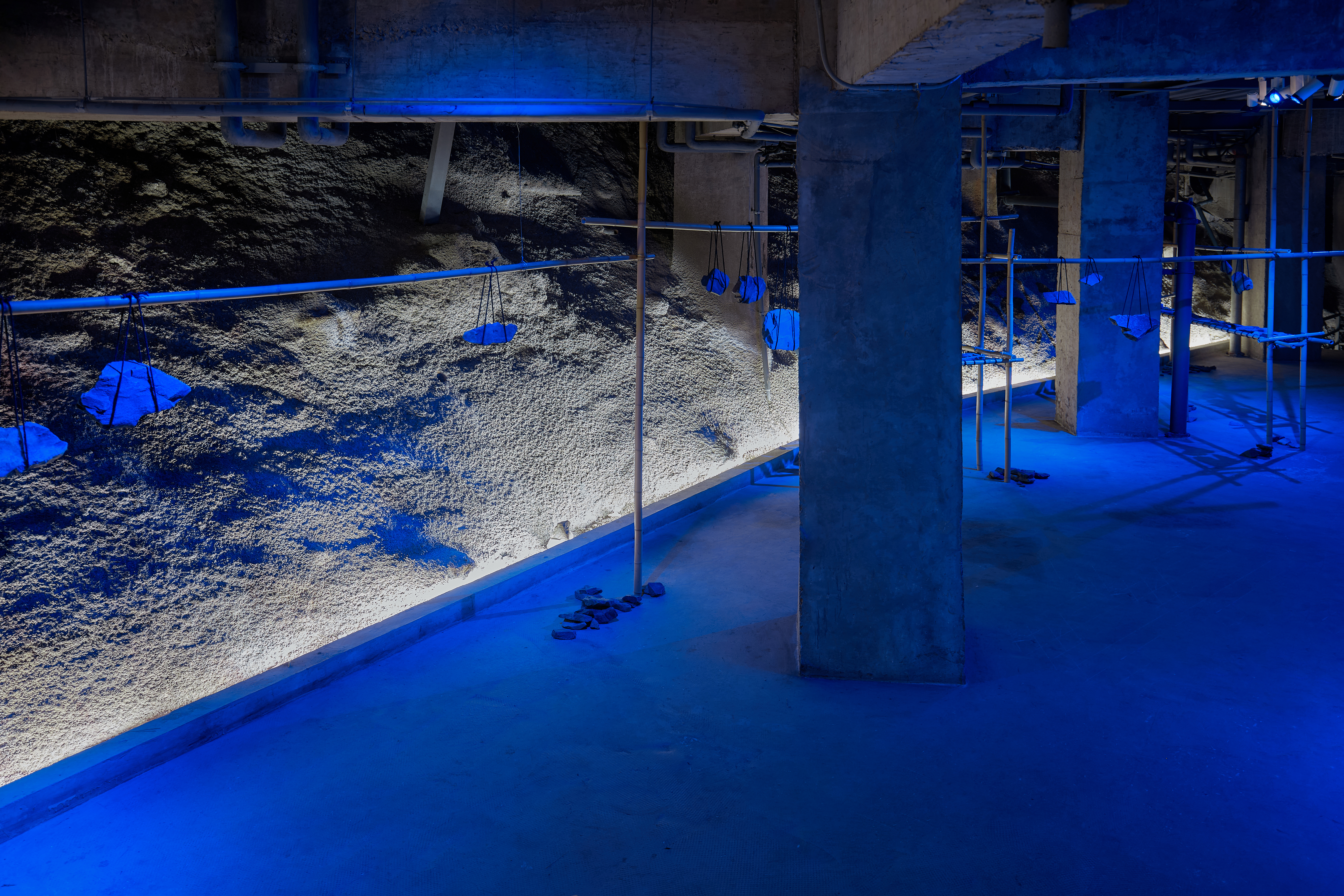 展览将北丘美术馆的展厅想象成一个巨大的岩间机器,在设计中亦大量使用在实际基建中会使用的可回收材料,将现场转换成一个如同在建设又如同废弃的,时间里的「虚空基建」,安放在岩层之间。