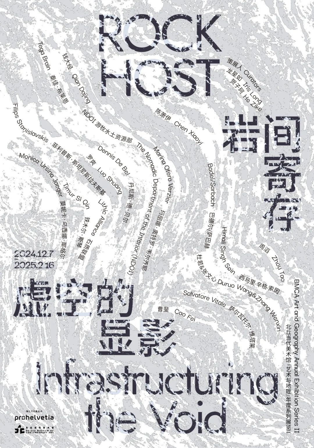 Rock Host, Infrastructuring the Void originates from the three-year-long research project Under the Cloud: Guizhou by Iris Long and He Zike. This exhibition, evolving from a collective project that began with the karst mountain regions of Southwest China as its entry point and initial sample, explores the embodied traversal from “above the cloud" to “below the cloud." It narrates, through subtle connections,the coexistence of new technological infrastructures—including data centers—with geology, energy, climate, ecology, and human life, both locally and across broader terrains. In English, host signifies both a “hostorganism" and a “host computer." Here, the materiality of rock becomes a source of inspiration, serving as a vessel in deep time that holds the digital void. It also shapes experiences within varying cosmic perspectives, natural forms, and historical contexts.